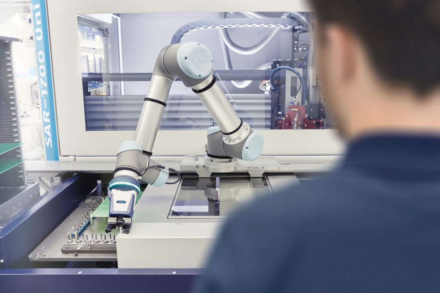 Technisch nutzen wir mehrere Systeme parallel: Zunächst einmal eine kapazitive Sensorik, sprich es wird ein elektrisches Feld um den Greifer aufgebaut. Sobald etwas stark wasserhaltiges, beispielsweise die menschliche Hand, in dieses Feld eindringt, wird es detektiert. So ist es möglich, die Annäherung von Bauteilen oder anderen Greifern von der Annäherung von Fingern, Händen oder Armen zu unterscheiden. Im Gegensatz zu den am Markt etablierten Möglichkeiten zur Arbeitsraumüberwachung, die eher ein weiteres Umfeld abdecken, ermöglicht die kapazitive Sensorik die unmittelbare Detektion eines engen Radius von 20 cm und damit wirklich closest to the human, bevor es überhaupt zu einem Kontakt kommt.