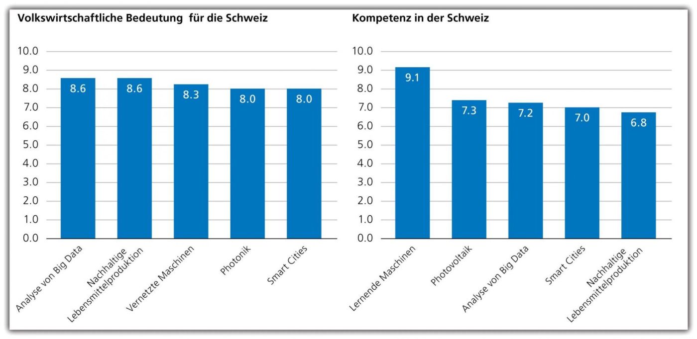 Im dritten Technology Outlook der Schweizerischen Akademie der Technischen Wissenschaften SATW beurteilen Fachleute das Potenzial von 37 vielversprechenden Technologien. Erstmals wurden auch quantitative Aspekte berücksichtigt. Die Top-Technologien aus volkswirtschaftlicher Sicht sind Big Data und Nachhaltige Lebensmittelproduktion. In Bezug auf die hierzulande vorhandene Kompetenz sind es Lernende Maschinen und Photovoltaik.