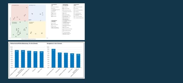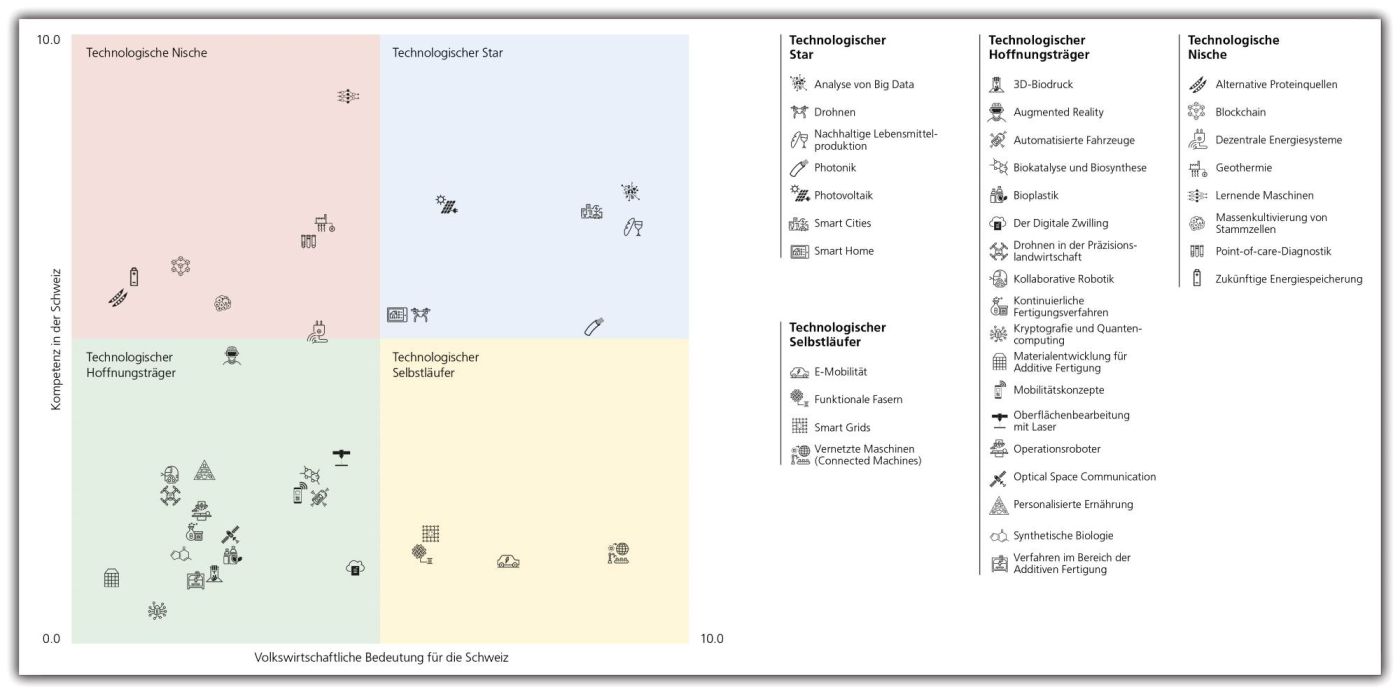 Erstmals wurde der Technology Outlook mit semiquantitativen Angaben hinterlegt. Diese basieren auf dem Wissen von Expertinnen und Experten sowie auf umfangreichen Recherchen und erlauben es, die relative Bedeutung der einzelnen Technologien für die Schweiz abzuschätzen. «Stars», «Selbstläufer», «Hoffnungsträger» oder «Nischen» – jede Technologie wird aufgrund der Angaben einem von vier Quadranten zugewiesen, die durch die volkswirtschaftliche Bedeutung und die Kompetenz in der Schweiz definiert sind.