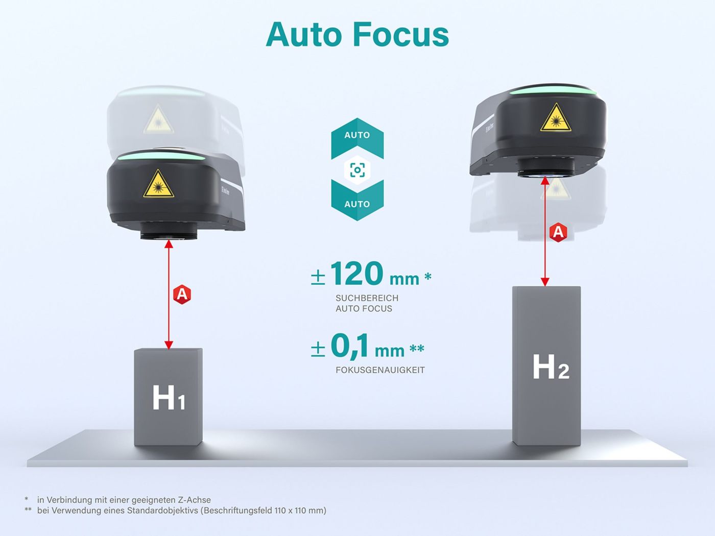 - Konstante Beschriftungsqualität: Auch bei Bauteilen mit variierenden Fertigungstoleranzen sorgt AutoFocus für eine stets optimale Fokuslage.