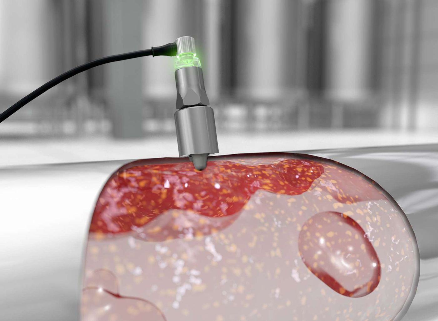 Dies führt zu Verschwendung von mehreren Kilogramm Fruchtzusatz pro Container, was sich schnell zu mehreren Zehntausend Euro unnötiger Kosten pro Jahr summieren kann. Oder, noch schlimmer, die Sensoren bemerkten den Leerstand nicht und liessen die Anlage mit leerem Container weiterlaufen. Dadurch gerät Stickstoff in die Pumpe, was einen langen Wartungsprozess zur Folge hat. Daraus resultieren bis zu 15 Minuten Stillstand, ein Zeitraum, in dem sonst Tausende Becher Joghurt produziert werden könnten.