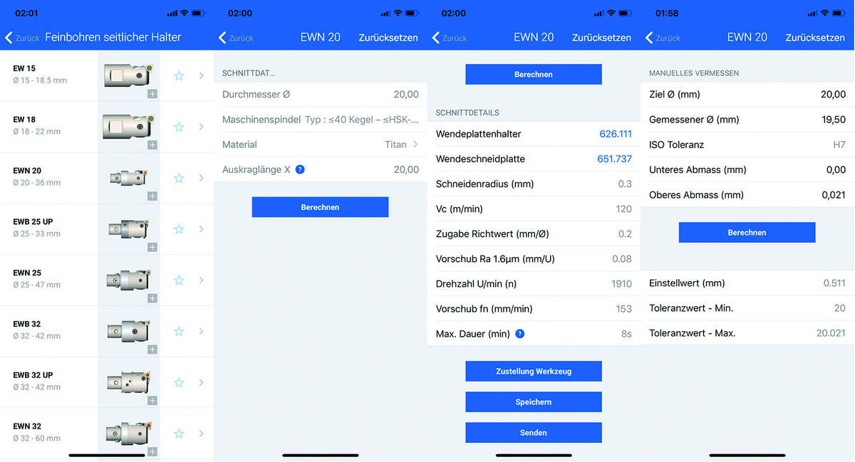 Rainer Maurer berichtet: «Bei uns läuft der Feinbohrprozess im Zusammenspiel mit der CAM-Programmierung inzwischen folgendermassen ab: In der App geben wir die gewünschten Parameter ein, zum Beispiel Bohrungsdurchmesser, Material und Auskraglänge. Die App gibt uns an, welches unserer Big Kaiser Werkzeuge mit welcher Wendeschneidplatte ausgestattet werden soll, welche Verlängerungen eventuell benötigt werden und welche Schnittdaten einzustellen sind. Dann wählen wir den entsprechenden digitalen Werkzeugzwilling am CAM-Arbeitsplatz aus und programmieren die Schnittwerte – fertig. Dabei wird immer der optimale Schnittwert ausgewählt. Der Bediener muss nicht mehr mit verschiedenen Werten experimentieren, sondern kann sich auf die Ergebnisse aus der App von Big Kaiser verlassen, was den Prozess enorm vereinfacht.»