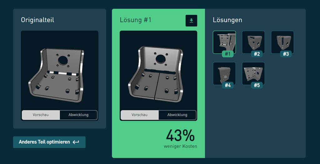 Die Web-App-Lösung von Optimate enthält automatisierte Potenzialerkennung und KI-basierte Bauteiloptimierung mit integrierter Umkonstruktion. Ein wirkungsvolles Tool also für die Blechbearbeitung, um die Prozesssicherheit zu erhöhen.