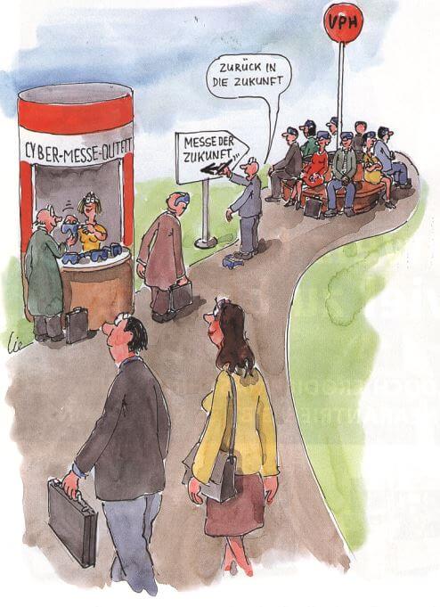 Mancher ärgert sich heute vielleicht über teure Messeauftritte, aufwändige Ausstellungsbesuche und lange Stunden im Stau. Doch in einer nicht mehr ganz so fernen Zukunft vermissen wir das Messe(un)wesen. Ein Blick zurück aus einer wahrlich «cyberhaften» Zukunft.