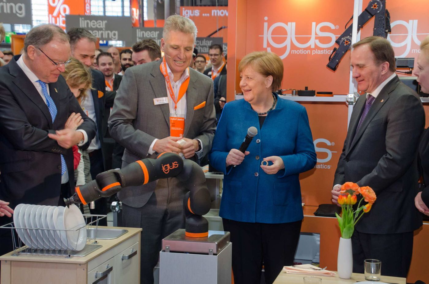 Der gezeigte Service-Roboterarm könnte demnächst auf Zuruf das Geschirr trocknen und den Tisch decken. «Wir möchten der Bundeskanzlerin auch nach Ihrer Amtszeit den Service erhalten, den sie im Kanzleramt hatte. Dadurch bekommt sie mehr Zeit für andere Dinge, zum Beispiel um politische oder wissenschaftliche Bücher zu schreiben», meint Geschäftsführer Frank Blase mit einem Augenzwinkern. «In ein bis zwei Jahren wird ein solcher Roboter serienreif und erschwinglich sein.» Igus nutzt die Hannover Messe, um mit Kunden aus der Welt der Haushaltsgeräte ins Gespräch zu kommen. Die Servicerobotik ist ein wichtiges Zukunftsthema der Branche.