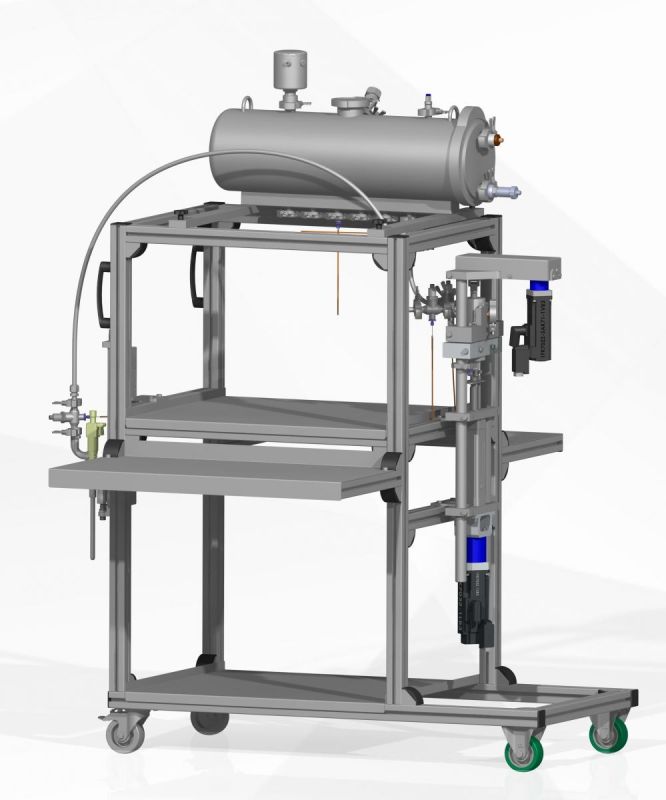 Die Siegeltechnologie und die Verpackungseinheit wurde für die Forschung am Abfüllprozess nicht integriert. Als Arbeitsmedien kamen wahlweise Wasser oder dickflüssigere Substanzen (z.B. Senf) zum Einsatz. Wie beim Kavitationsprüfstand wurden hochauflösende Sensoren integriert, um wichtige Daten über das Strömungsverhalten aufzuzeichnen.