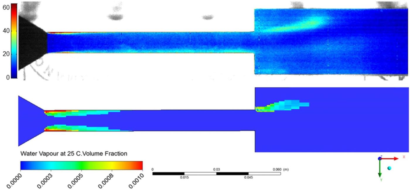 Dieses beschreibt das Verhalten von Gas- oder Dampfblasen in einer Flüssigkeit sowie die Verdampfung und Kondensation mit Hilfe des Sättigungsdruckes. Für die Kalibrierung des Modells und um die Simulationen zu validieren wurden die Resultate mit High-Speed-Kameraaufnahmen am Kavitationsprüfstand verglichen. Die Kameraaufnahmen wurden über einen bestimmten Zeitraum im Bereich der Kanalverengung gemittelt und eingefärbt (siehe Abbildung 3, oben).