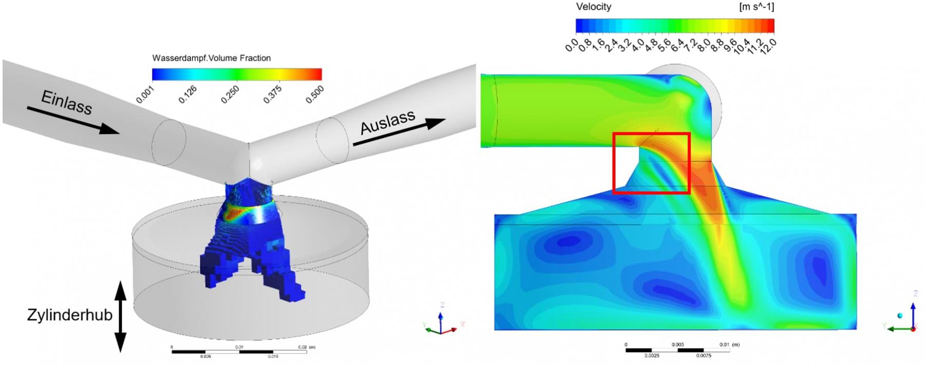 In diesem Fall ist der grosse Vorteil der CFD-Analysen im Vergleich zu den experimentellen Untersuchungen, dass nicht nur Kavitation, sondern auch die Stellen mit auftretender Blasenbildung detektiert werden können. Zudem ist ein erweiterter Einblick in das Strömungsverhalten im Pumpeninnenraum möglich. Abbildung 5 (links) zeigt Regionen mit einem erhöhten Dampfanteil während des Ansaugvorgangs. Der Grund für den Phasenwechsel an dieser Stelle liefert die Geschwindigkeitsverteilung im Schnitt durch die Kolbenpumpe (siehe Abbildung 5, rechts): Durch die erhöhte Geschwindigkeit beim Einströmen in den Zylinder tritt eine Strömungsablösung auf (siehe Abbildung 5, Markierung rechts), was in einem starken Unterdruck resultiert.
