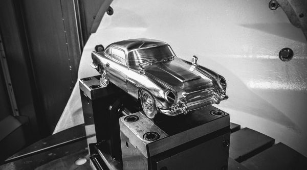 Der Aston Martin DB5 wurde im hauseigenen Technologiecenter von Blaser aus Aluminium (AW-6082 AlSi1MgMn) zerspant. Die Technologie der Minimalmengenschmierung wird passenderweise am häufigsten in der Automobilindustrie eingesetzt und besteht aus einem Öl-Luft-Gemisch. Dabei wird die Mischung durch die Spindel und das Werkzeug an die Schneide geführt.