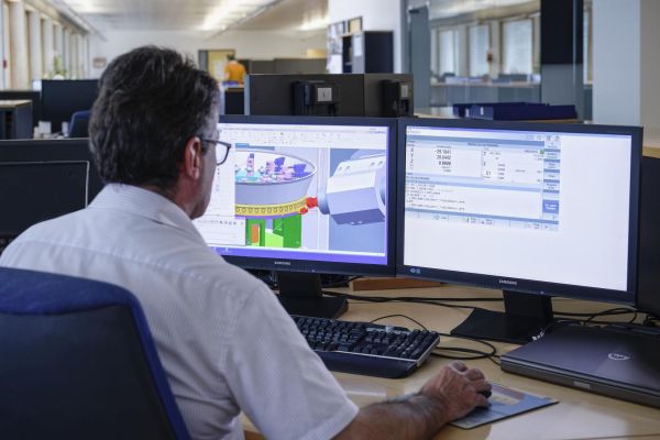 Wo früher mehrere Maschinen zum Einsatz kamen, fertigt heute die neue Maschine das gesamte Bauteil im Alleingang. Die Zeitersparnis kann sich sehen lassen: Der Brennkammer-Ring wird in 14 Stunden produziert, früher dauerte dies mit 40 Stunden fast dreimal so lange. Mägerle entwickelte für den Kunden nicht nur die Maschine, sondern auch das zugehörige CNC-Programm. Hier betrat das seit 1929 bestehende Unternehmen Neuland und setzte auf die Technologie des «digitalen Zwillings» von Siemens. Dabei werden die komplette Maschine und alle Prozessschritte virtuell auf dem PC abgebildet.