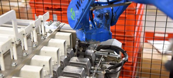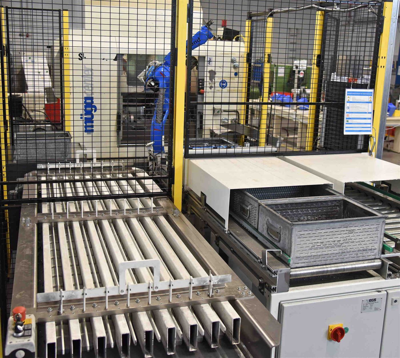 Im konkreten Fall wählte EGS den Motoman MH12 für sämtliche Handhabungsaufgaben innerhalb der mit einem Schutzzaun gesicherten Zelle. Die lagerichtige Bestückung der insgesamt acht Spuren des Flexiplex mit unbearbeiteten Teilen bleibt ebenso Aufgabe des Anlagenbedieners wie die Bevorratung leerer Metallbehälter für die Aufnahme bearbeiteter Teile. Die Behälter werden über eine angetriebene Rollenbahn in den Arbeitsbereich der Zelle gebracht und in gefülltem Zustand auf eine Pufferstrecke ausgeschleust. Grosser Vorteil: Diese Tätigkeiten können auch hauptzeitparallel erfolgen.