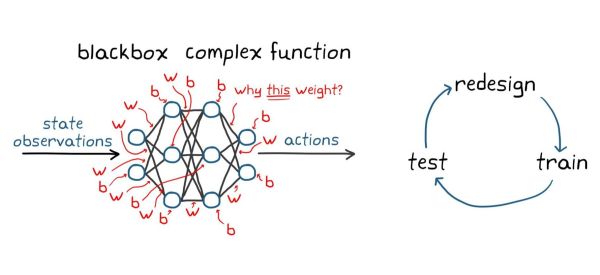 Die Strategie eines trainierten tiefen neuronalen Netzes wird oft als «Black Box» behandelt. Dies bedeutet, dass die interne Struktur des neuronalen Netzes so komplex ist – häufig mit Millionen Parametern –, dass es fast unmöglich ist, seine Entscheidungen zu verstehen, zu erklären und zu bewerten (linke Seite von Abbildung 3). Daher ist es schwierig, die Leistung von Strategien neuronaler Netze formal zu garantieren. Betrachten Sie es so: Auch wenn Sie Ihr Haustier erziehen, wird es Ihre Befehle ab und zu einfach nicht hören.