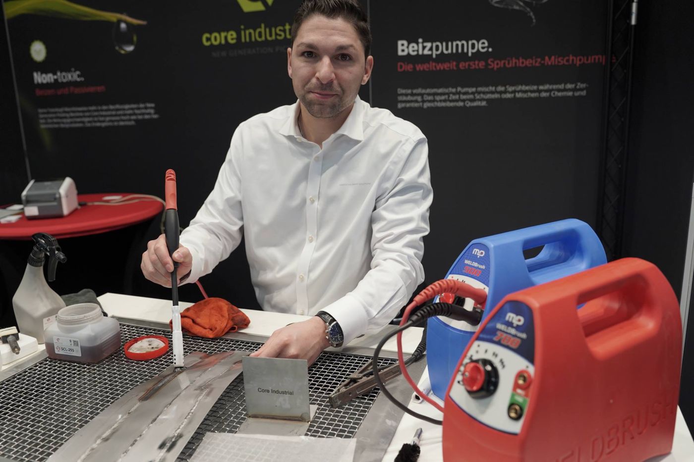 Auf der Ble.ch, wo das Schweissen allgegenwärtig ist, spielt auch die Reinigung der Schweissnähte eine wichtige Rolle. Hier sticht der Stand von Core Industrial hervor. Hier ist Florian Talaj in seinem Element, der Sales Representative in der Schweiz für das Unternehmen. Das Besondere an den so genannten Weldbrush-Geräten ist die Verwendung nicht-toxischer Mittel, was ein umweltfreundliches Arbeiten ermöglicht. «Unsere Geräte entfernen Verfärbungen und passivieren die Oberfläche in einem Arbeitsgang, ganz ohne Rückstände», erklärt Talaj. Dank der 100-prozentigen Einschaltdauer, der konstanten Spannungsregelung und bis zu drei Leistungsstufen gehören diese Modelle zu den effizientesten auf dem Markt.