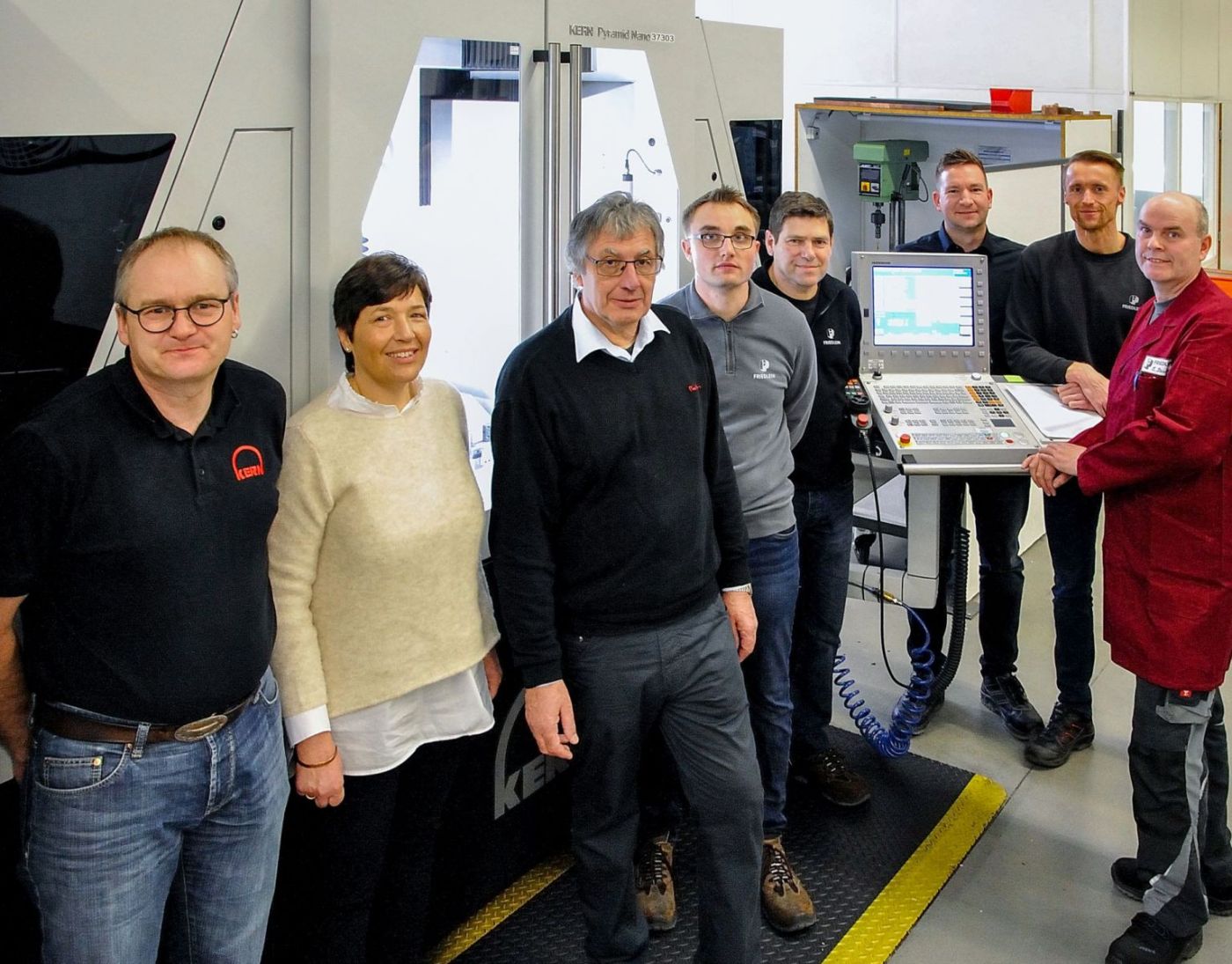 Leicht gemacht wurde der Friedlein GmbH & Co. KG die Entscheidung für die Kern Pyramid Nano auch durch die Zusammenarbeit mit den Konstrukteuren des Maschinenbauers aus Eschenlohe bei der Entwicklung des speziellen Konzepts für diese massgeschneiderte Anlage. Telefonisch und anhand von Zeichnungen arbeiteten sich der Kern-Maschinenbautechniker Anton Rohrmoser und seine Kollegen zusammen mit Johannes Fischer und seinen Elektrodenfräsprofis der Friedlein GmbH & Co. KG, Schritt für Schritt an die Wunschlösung heran. So wurde etwa ausgetüftelt, wie man den Laser zum Abtasten der Werkzeuge am besten verschiebt, um den Arbeitsraum – zusätzlich zur Absenkung des Tisches – weiter vergrössern zu können.