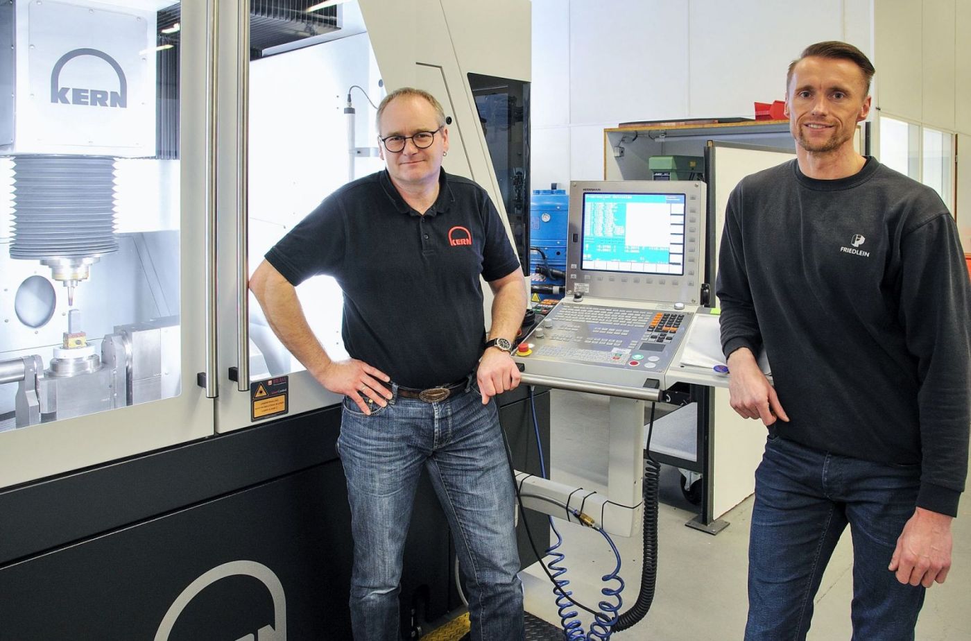 In einem ausführlichen Auswahlprozess konnte sich schliesslich die Kern Microtechnik GmbH mit einem speziell modifizierten 5-Achs-Fräszentrum vom Typ Kern Pyramid Nano gegen die Wettbewerber durchsetzen. In der Maschine wurde unter anderem ein um 200 mm abgesenkter Arbeitstisch realisiert, und sie bekam zur Automatisierung einen Werkstückwechsler vom Typ Erowa. Ein Gesamtpaket, mit dem sich das Team der Friedlein GmbH & Co. KG nach gut einem halben Jahr Arbeit mit der neuen Maschine vollauf zufrieden zeigt. «Das Volumen, das wir früher mit zwei Maschinen gefertigt haben, produzieren wir nun allein mit der Kern Pyramid Nano», berichtet Siemon.