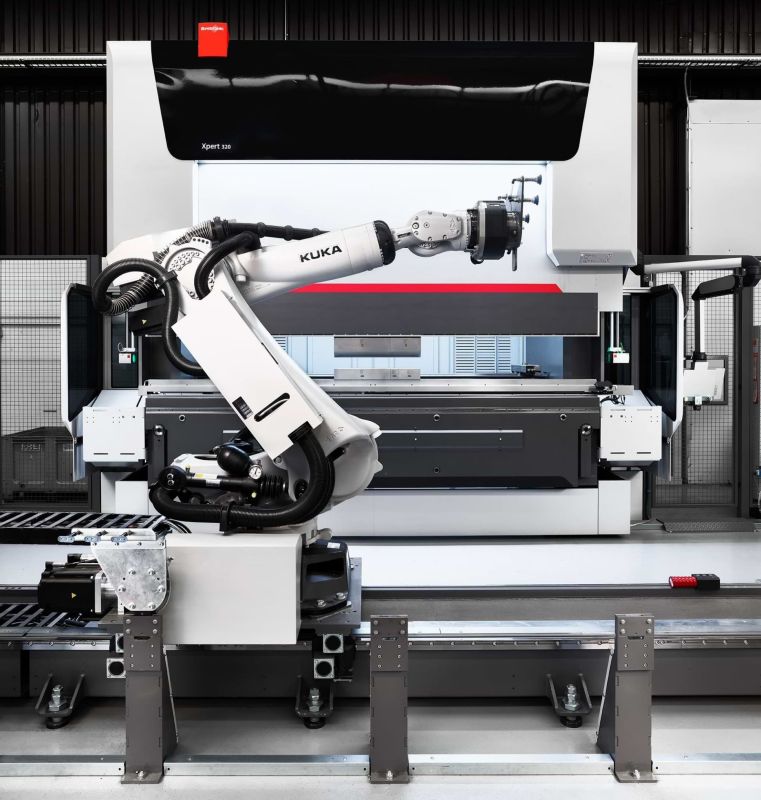 Die Bending Cell übernimmt das automatisierte Biegen der zuvor geschnittenen Blechteile. Dazu erweitert Bystronic die High-End-Abkantpresse Xpert Pro mit einer wendigen Robotik. Ein 7-achsiger Roboter greift die zu biegenden Blechteile auf, bringt sie präzise in Position zum Biegen an die Xpert Pro und sortiert sie anschliessend nach Aufträgen geordnet ab. Bewegt werden in der Bending Cell Blechteile bis zu einem Gewicht von 270 Kilogramm.