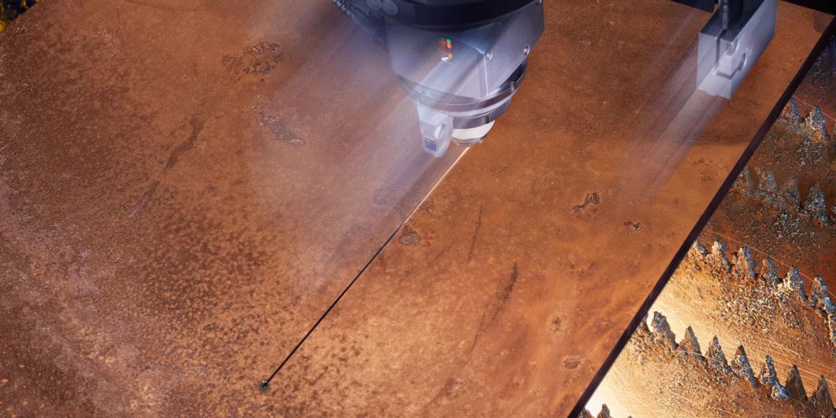 Der Schnittspalt verrät viel über die Teilequalität und die Prozessstabilität. Je leichter das geschmolzene Material aus dem Spalt austritt, desto reibungsloser schneidet die Maschine. In Bau- und Edelstahlblechen ab vier Millimeter nimmt Active Speed Control diesen Schmelzfluss unter die Lupe. Die Sensorik blickt dafür durch die Düse und beobachtet die Strahlung, die beim Schmelzen des Materials entsteht. Anhand dieses sogenannten Prozessleuchtens bestimmt sie, ob die Schmelze wie geplant austritt, ermittelt den schnellstmöglichen Vorschub und regelt bei Bedarf nach - und das viele hundert Mal pro Sekunde. Auf diese Weise stellt Active Speed Control den optimalen Vorschub auch dann sicher, wenn die Blechdicke innerhalb einer Tafel variiert oder die Oberseite durch Rost oder Lacke verunreinigt ist. Solche Materialunterschiede führen für gewöhnlich häufig dazu, dass sich Schlacke bildet oder der Schnitt abreisst.