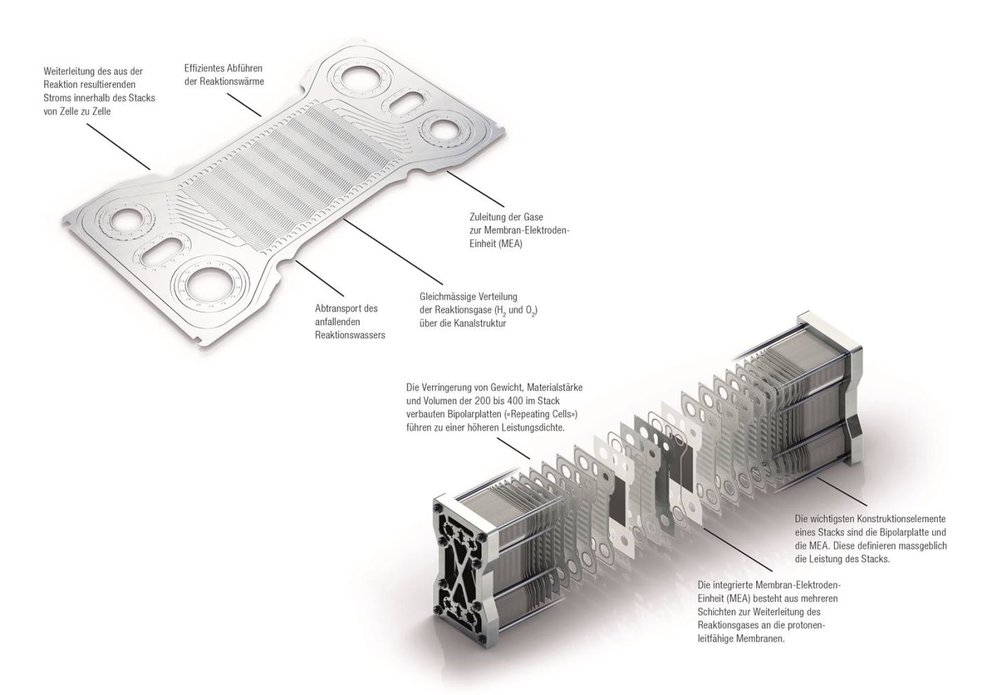 Wichtig ist auch, dass sie in sehr grossen Stückzahlen produziert werden können, denn ein Brennstoffzellensystem, also ein Brennstoffzellen-Stack, besteht aus mehreren hundert dieser Bipolarplatten. Die gleiche Technologie ist auch geeignet, um die Interconnects für Elektrolyseure herzustellen. Elektrolyseure sind erforderlich, um mit elektrischem Strom aus Wasser Wasserstoff herstellen zu können. Wie bei einem Brennstoffzellen-Stack sind auch bei einem Elektrolyseur-Stack Aktivelemente in hoher Stückzahl erforderlich.