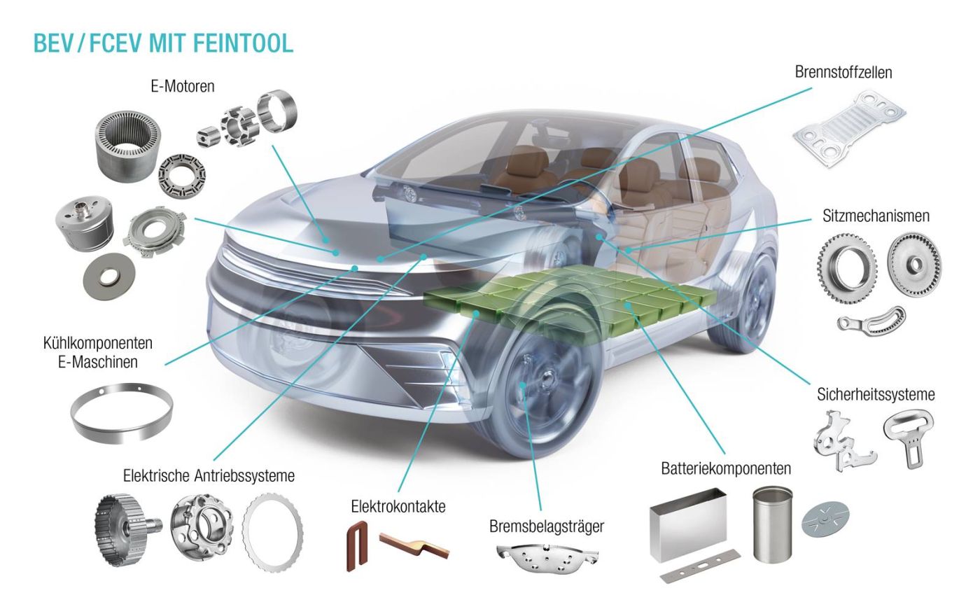 (lacht) Das kommt darauf an, wie man zählt! Wenn man seriös rechnet, muss man sagen, dass ein Rotor, der aus etwa 300 bis 400 Blechen besteht, letztlich ein Teil ist, genauso wie ein Stator. Aber es sind sehr hochwertige Teile. Und darauf kommt es uns an! Nicht so sehr um die Stückzahl, sondern um den Wert, den wir in das Fahrzeug einbringen. Mit Rotor und Stator liefern wir im Bereich Elektroblechstanzen zwei sehr hochwertige Komponenten, die über Effizienz und Leistung des Fahrzeugs entscheiden. Immer mehr elektrische Fahrzeuge verfügen über Allradantrieb und haben somit nicht nur einen, sondern zwei Elektromotoren, was den Wertschöpfungsanteil von Feintool nochmals erhöht. Aber unsere Bauteile stecken natürlich nicht nur im Elektromotor, sondern in vielen weiteren Baugruppen eines Fahrzeugs, von der Batterie über die Bremsen bis zu den Sitzen.