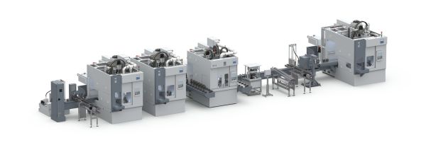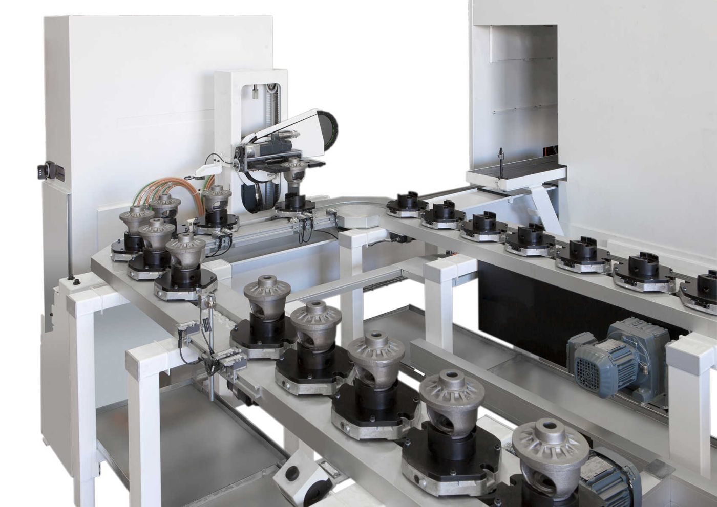 Hierbei fährt ein Hub-Wendewagen mit programmierbarem Elektrogreifer auf einer Schiene (Track) zwischen den Maschinen hin und her und setzt die Differentialgehäuse auf einem Transportband ab. Anschliessend transportiert die Pick-up-Arbeitsspindel die Bauteile in den Arbeitsraum hinein und heraus – ein schneller Prozess mit niedrigen Nebenzeiten. Nicht zuletzt ist die Aufstellfläche der Linie angesichts der kompakten Vertikalmaschinen sehr klein und die Module lassen sich einfach für den Rüstprozess erreichen.