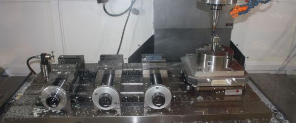Auf dem Arbeitstisch der Mikron VCE 1200 Pro befinden sich drei Schraubstöcke und ein Nullpunktspannsystem, dass durch den System 3R WorkPal 1 befüllt wird.