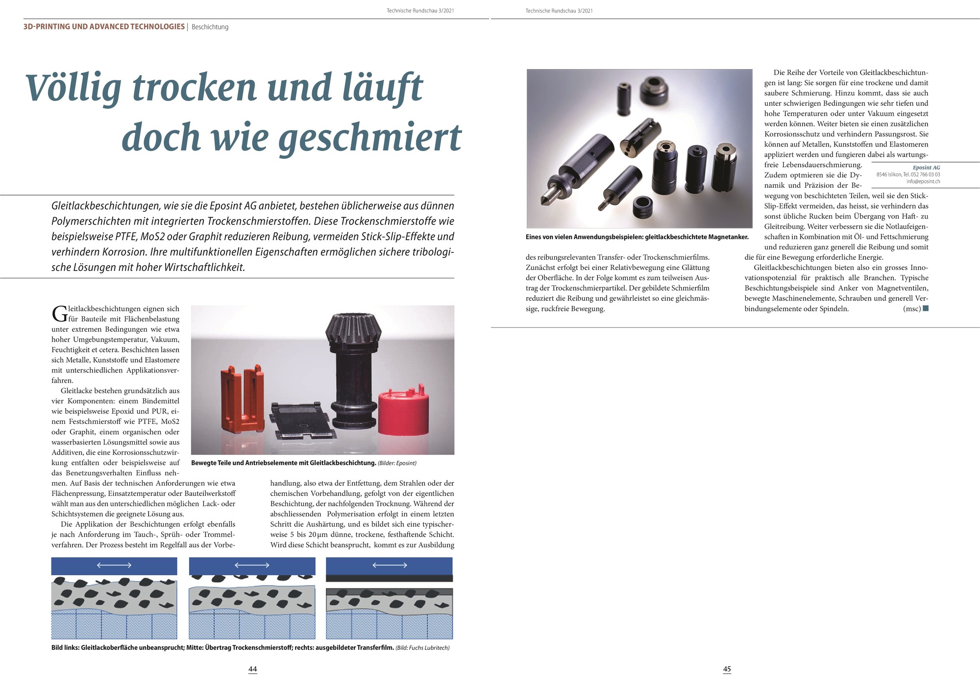 16.05.2020 / Eposint - Bei den Beschichtungswerkstoffen kommen laufend neue Innovationen hinzu, die vielen Firmen bei ihren Produkten zu einem entscheidenden Vorsprung verhelfen. Einer der Technologieführer für Entwicklung und Einsatz leistungsstarker Beschichtungswerkstoffe in der industriellen Fertigung ist die Firma Eposint. Der folgende Artikel (als Bilddatei zum Vergrössern) beschreibt eine Gleitlackbeschichtung mit multifunktionalen Eigenschaften, die Reibung reduzieren, Stick-Slip-Effekte vermeiden und Korrosion verhindern.