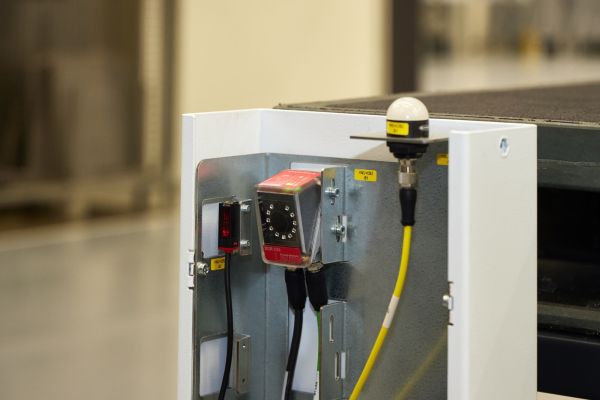 Für den Betrieb der Docking-Station sowie zur Übertragung von Daten ins System kommen Leuze Sensoren zum Einsatz. An einer Docking-Station sind dies in der Regel drei Stück: Ein Sensor HT5.1/4X ist unten an der Station installiert. Er erfasst die Anwesenheit eines Wagens. Ein weiterer Sensor dieses Typs befindet sich oben an der Docking-Station. Dessen Aufgabe ist es, die Anwesenheit von Paletten zu registrieren. Ist eine Palette erkannt, startet der HT5.1/4X deren Identifikation über einen weiteren Sensor. Hierfür ist ein DCR202iC installiert: Der Scanner erfasst über den auf der Palette abgebildeten 2D-Code Auftrags- und Materialdaten und übergibt sie ans Transportleitsystem.