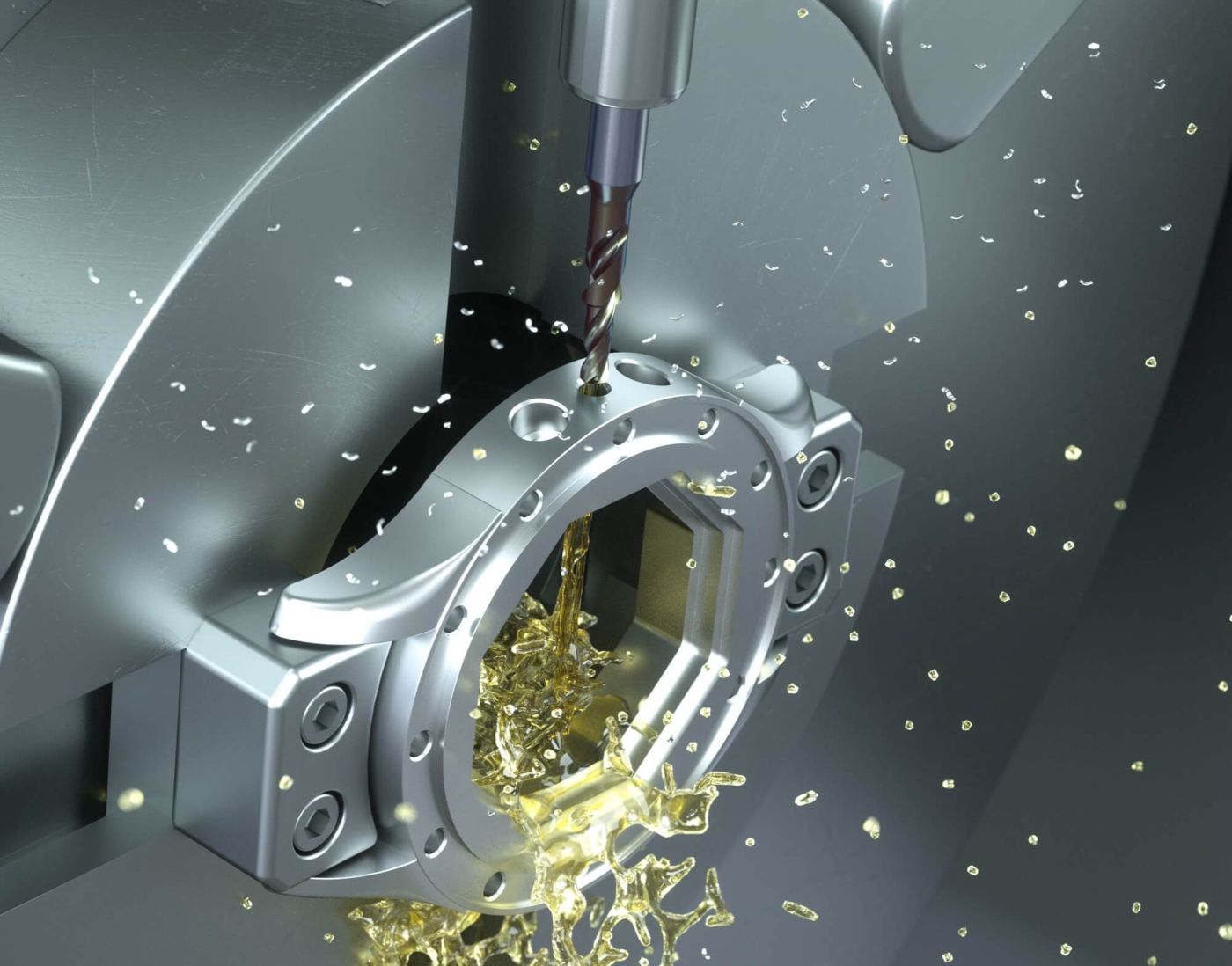 Abhilfe schaffen hier scharf geschliffene Schneiden, die gleichzeitig stabil sein müssen – ein Widerspruch in sich. Mikron Tool hat eine geniale spezifische Schneidengeometrie entwickelt, die diesen Spagat meistert, infolgedessen die Schnittdrücke signifikant gesenkt werden können. Wie oben beschrieben, muss die Wärme aus der Zerspanzone gebracht werden. Die Lösung: zwei Kühlkanäle mit sehr grossen Querschnitten führen massiv Kühlmittel bis zur Bohrspitze und garantieren eine konstante Kühlung inklusive Schmierung der Schneiden. Gleichzeitig spült der massive Kühlmittelstrahl die Späne durch die polierten Spannuten und verhindert Spänestau.