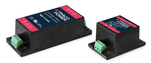 Die Module kommen in vollständig gekapselten Plastikgehäusen mit den Abmessungen 53 x 34 x 26,4 mm (TMDC 06) oder 79 x 34 x 22,1 mm (TMDC 10) und einem Temperaturbereich von -40 bis +80 °C ohne Lastreduktion.
