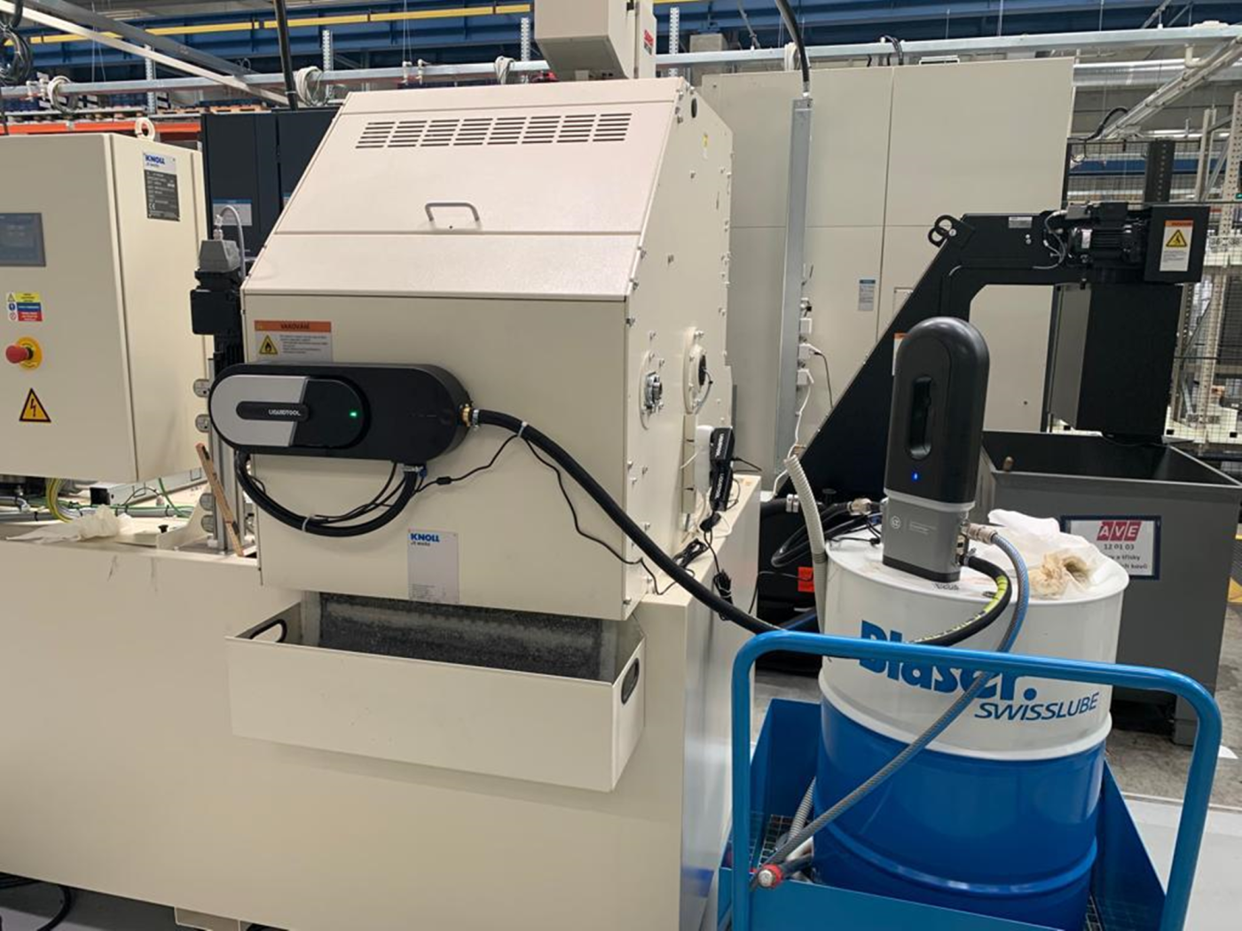 Die intelligente, IIoT-basierte Plug & Play-Lösung kombiniert Hardware-Elemente und eine cloudbasierte Plattform mit intelligenter, automatisierter und zuverlässiger Messung zu einer Innovation, die metallverarbeitende Unternehmen weiter in Richtung Industrie 4.0 bringt. Dank regelmässiger und automatischer Füllstands- und Konzentrationsmessung kennt das Gesamtsystem jederzeit den Zustand der Kühlschmiermittel in den Tanks. Ein Überwachungsmodul wird magnetisch an die zu überwachenden Maschine angebracht, das andere auf dem Konzentrat-Fass oder IBC daneben. Durch die Verbindung mit dem Firmen-LAN oder –WLAN kann die Lösung mit der dazugehörigen App via Tablet, Smartphone oder Computer bedient werden.
