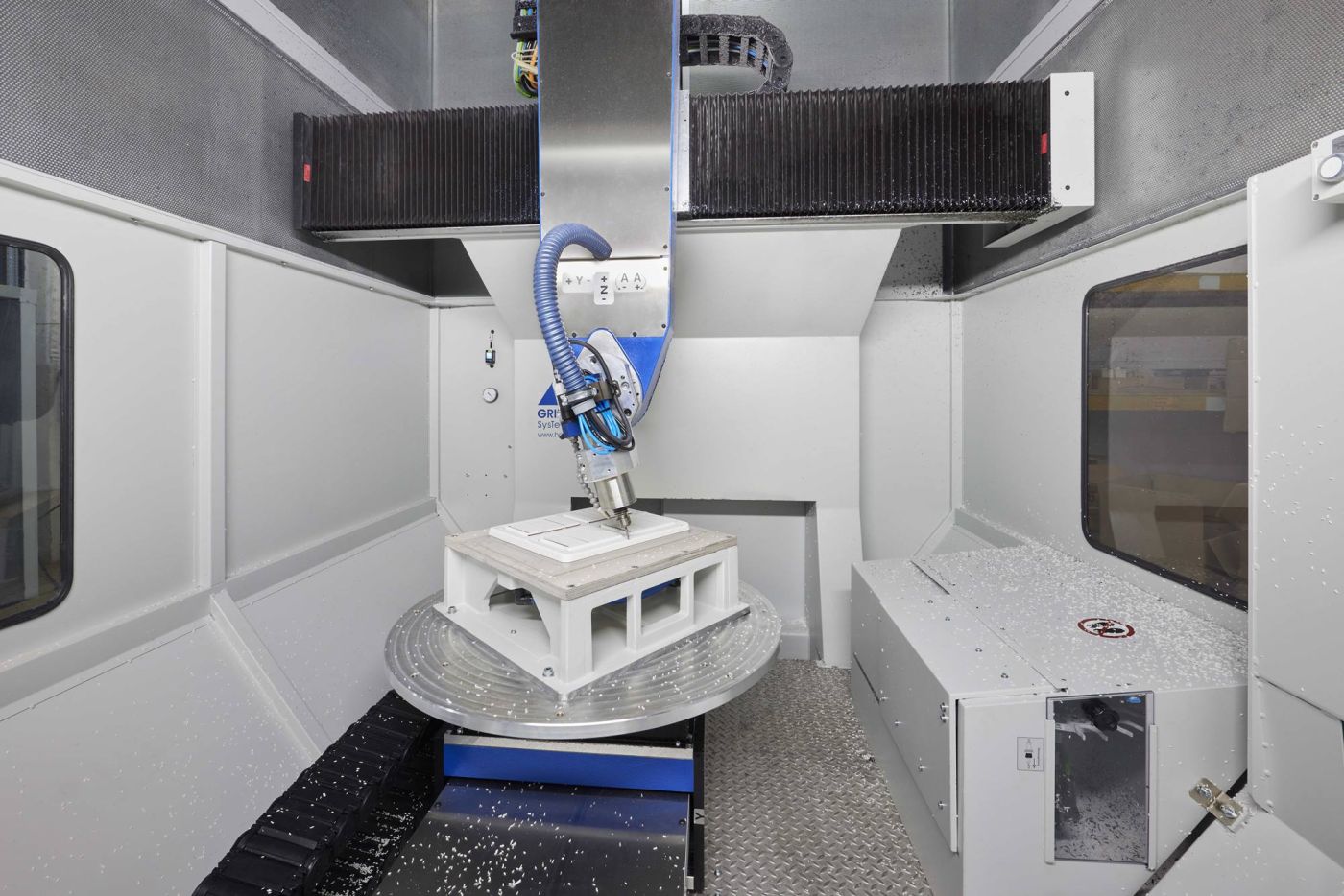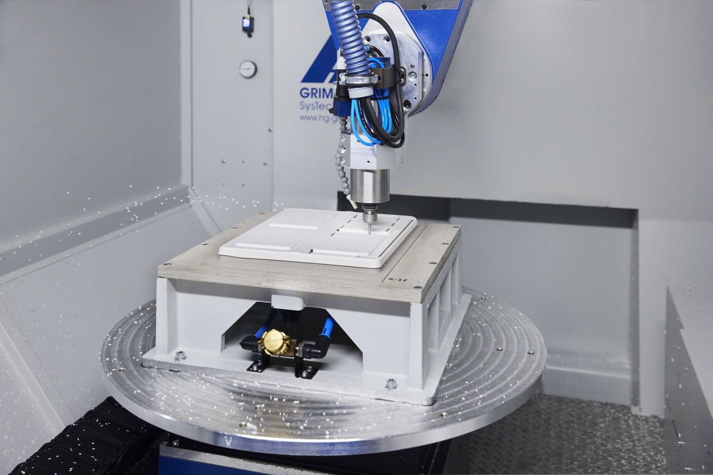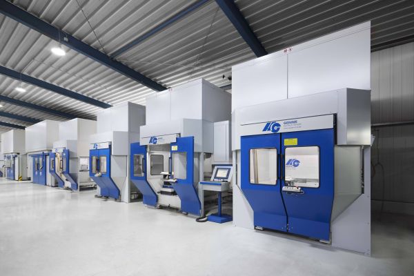 Die Maschinen von HG Grimme haben sich bewährt: Während früher noch Sägen und konventionelle Fräsen verwendet wurden, revolutionierte das 5-Achs-Simultanfräsen die Nachbearbeitung ab den 1990er-Jahren. Es verbesserte die Qualität und beschleunigte die Bearbeitungsprozesse. In Overath kommen Gantry-Maschinen der Baureihe G-S-F mit Ein- und Zwei-Achs-Schwenkkopf für grössere Bauteile und Rundtischmaschinen der R-TF-Baureihe 1400 mit Ein-Achs-Schwenkkopf und Drehachse im Tisch zum Einsatz. Die R-TF-Maschinen sind mit schneller Spindel (Drehzahl: 40.000 min-1), Werkzeugwechsler, NUM-Steuerung und Lichtschranke im Tor-Bereich ausgestattet.
