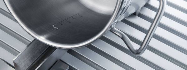 Markieren einer Skale in einem Topf. Zusätzlich zur Krümmung der Oberfläche meistert das Lasersystem auch die schiefe Ebene, um an der Innenseite zu markieren. (Bild: Trumpf)