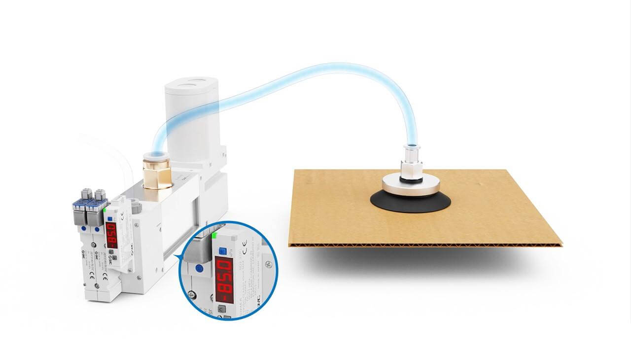 Die Orientierung von SMC am neuen 4-bar-Standard zeigt sich auch bei den Vakuumeinheiten, die bei geringem Betriebsdruck am besten funktionieren (maximale Effizienz). Mit 4 bar erreicht man den nötigen Vakuumdruck, um ein Bauteil oder Produkt sicher zu halten. Jenseits dieses Wertes wird Luft (und Geld) verschwendet, und die Effizienz der Vakuumeinheit nimmt ab. Erhöht man den Druck, ist das Ergebnis also nicht mehr Kraft oder Geschwindigkeit, sondern Ineffizienz.