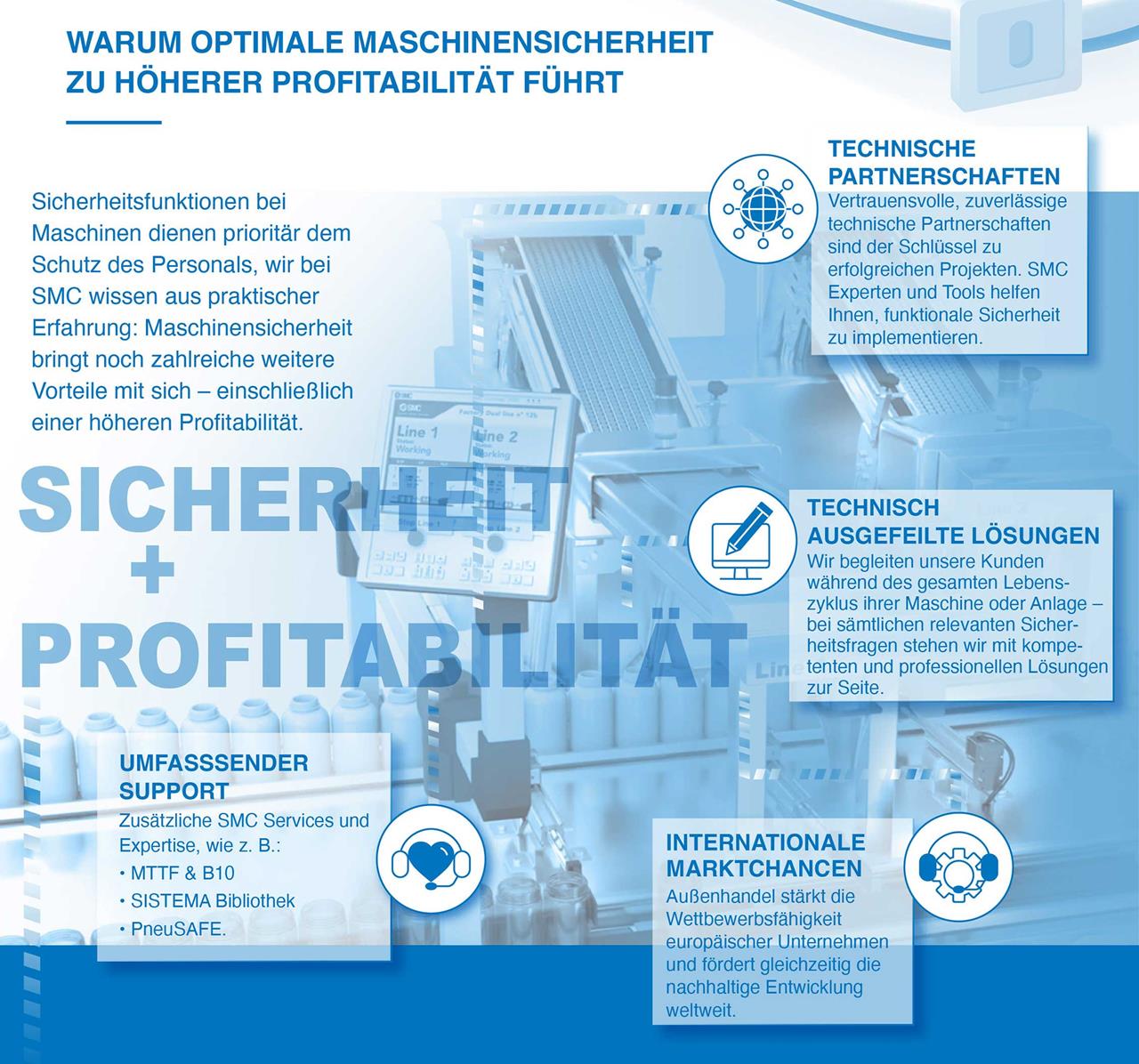 Zusätzliche Services und die Expertise von SMC umfassen alle sicherheitsrelevanten Parameter, wie z. B. MTTF (Mean Time to Failure, mittlere Betriebsdauer bis zum Ausfall) und B10 (ein statistischer Parameter, der die Anzahl der Schaltzyklen anzeigt, bis 10 % der Komponenten ausgefallen sind). Darüber hinaus bieten die Automations-Experten mit der SMC SISTEMA library, ein Softwaretool zur Bewertung der Sicherheit von Maschinenanwendungen. Auch die Software PneuSAFE, bietet eine einfache Hilfe, um die gängigsten Sicherheitsfunktionen und in der Praxis relevante Anwendungen zu planen. Schulungen und praktische Trainings runden das SMC-Angebot bezüglich Maschinensicherheit ab.