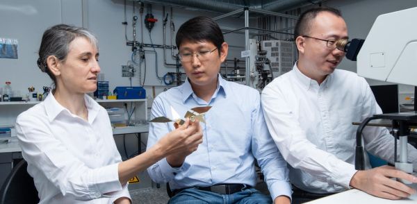 Laura Heyderman (links) und Tian-Yun Huang (Mitte) betrachten ein Modell des Origami-Vogels, während Jizhai Cui den echten Mikroroboter unter einem Mikroskop beobachtet. Was er dort sehen kann, zeigt das Video, das die Forschenden gemacht haben. (Bild: Paul Scherrer Institut/Mahir Dzambegovic)