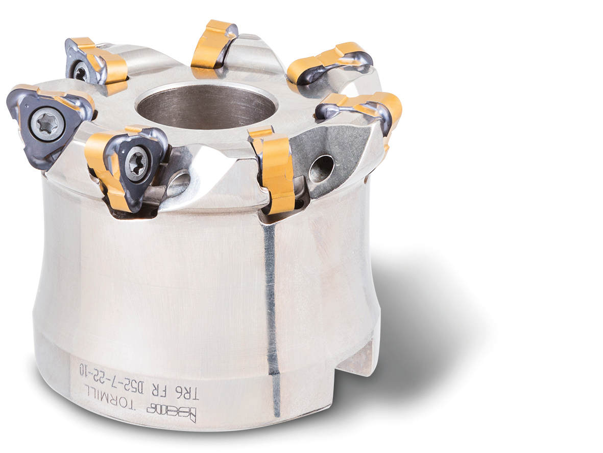 Die Fräser besitzen eine zielgerichtete Kühlmittelzufuhr zu jeder einzelnen Schneidkante. Dadurch werden Werkzeug und Werkstück optimal direkt in der Schnittzone gekühlt. Dies verbessert die Standzeit deutlich. Die Platten besitzen einen leicht positiven Spanwinkel für einen besonders weichen Schnitt. Der Grundkörper ist beschichtet und poliert – die Späne fliessen dadurch ungehindert ab. Darüber hinaus werden Korrosion und Verschleiss minimiert. Die TOR 6 MILL-Wendeschneidplatten sind aus den neuesten und hoch widerstandsfähigen SUMOTEC-Schneidstoffsorten gefertigt. Dies stellt eine hohe Produktivität durch lange Einsatzzeiten sicher.