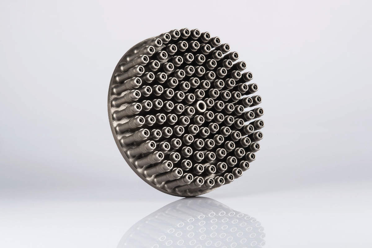 In einem Raketentriebwerk wirken enorm hohe Kräfte unter extremen Bedingungen. Dafür ist ein Höchstmass an Zuverlässigkeit und Präzision bei geringer Baugrösse gefragt. Der Einspritzkopf ist eines der zentralen Elemente des Triebwerks, da er das Treibstoffgemisch in den Brennraum einbringt. Konventionell hergestellt besteht er aus 248 Bauteilen, die in verschiedenen Fertigungsschritten produziert und montiert werden. Durch die Bearbeitungsschritte wie Giessen, Löten, Schweissen und Bohren entstehen Schwachstellen, die bei extremen Belastungen ein Risiko darstellen können. Darüber hinaus sind die vielen Schritte zeitaufwendig und komplex. Bei konventioneller Fertigung werden im Bereich der Einspritzelemente über 8000 Querbohrungen in Kupferhülsen gebohrt, die anschliessend mit den 122 Einspritzelementen präzise verschraubt werden, um den durchströmenden Wasserstoff mit dem Sauerstoff im Element zu vermischen. Ein Blick auf solche Zahlen macht deutlich, dass aus Sicht des Risikomanagements ein funktionsintegriertes Bauteil, das alle Komponenten in sich vereint, das ehrgeizige Ziel sein muss. Wenn damit zusätzlich Bearbeitungsschritte und Produktionszeit eingespart werden, setzt das enorme wirtschaftliche Potenziale frei, insbesondere für ein Bauteil der Klasse 1.