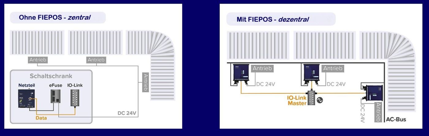 Mit der neuen Stromversorgungs-Produktfamilie FIEPOS schliessen die Entwickler von Puls nun diese Lücke in der Dezentralisierung und bieten Anwendern mehr Flexibilität in der Planung ihrer Anlagen und Maschinen. Mit dieser Lösung können Schaltschränke kleiner dimensioniert oder sogar ganz aufgelöst werden (siehe folgende Grafik).