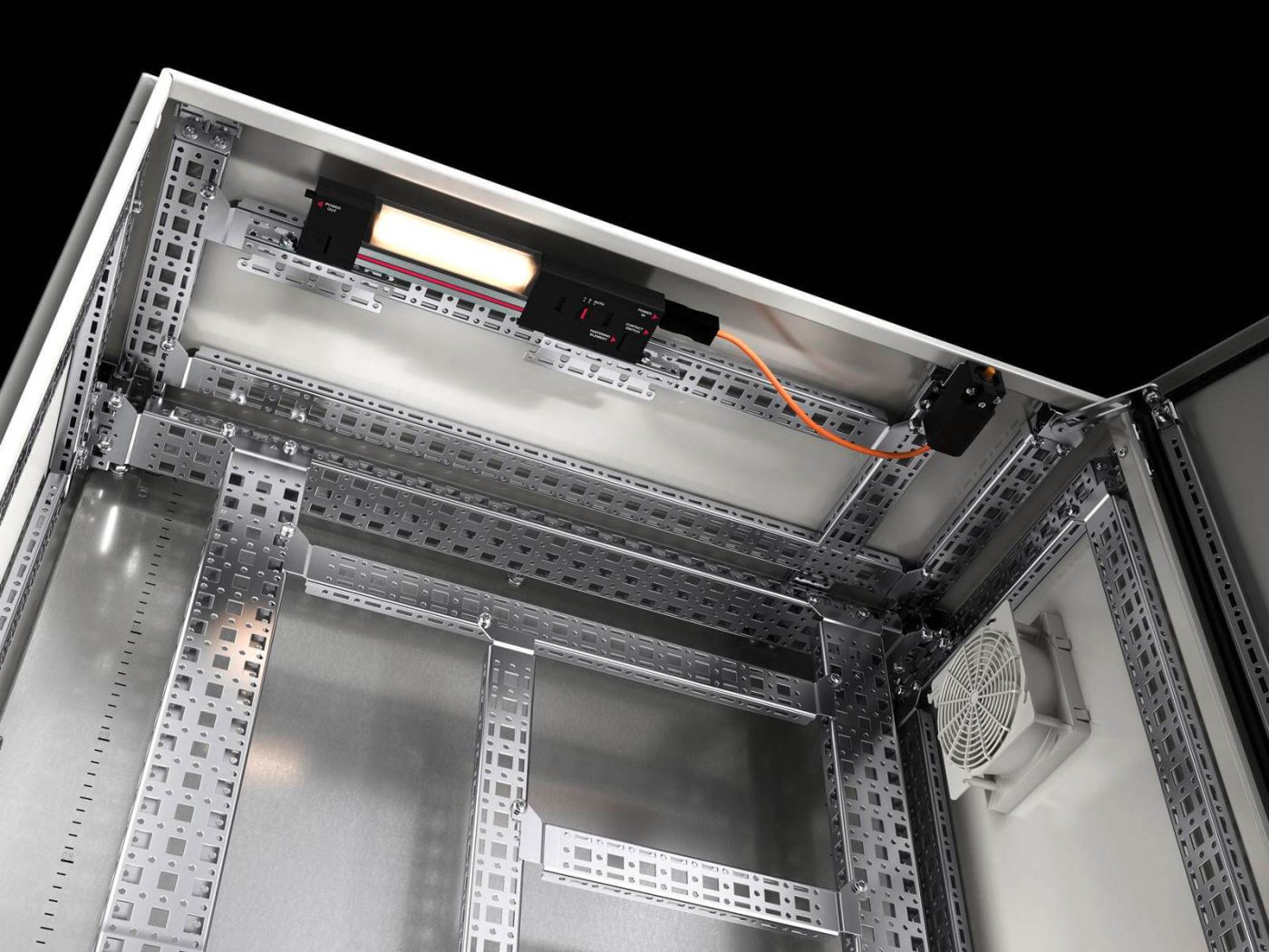 Zudem liegt in der Einfachheit auch mehr Effizienz: Durch Bohren entstandene Löcher müssen nicht entgratet, lackiert und abgedichtet werden – das spart (Zeit)Aufwand und Kosten. Und die Diskussionen darüber, ob die Schutzart noch gegeben ist. Zubehör wie Türpositionsschalter, Türarretierungen, Kabelschläuche, Klemmleisten oder Schaltschrankleuchten lassen sich gänzlich ohne mechanische Bearbeitung des Gehäuses direkt an den Innenausbauschienen befestigen. Das heisst auch, dass die UL-Konformität für den US-Markt garantiert erhalten bleibt.