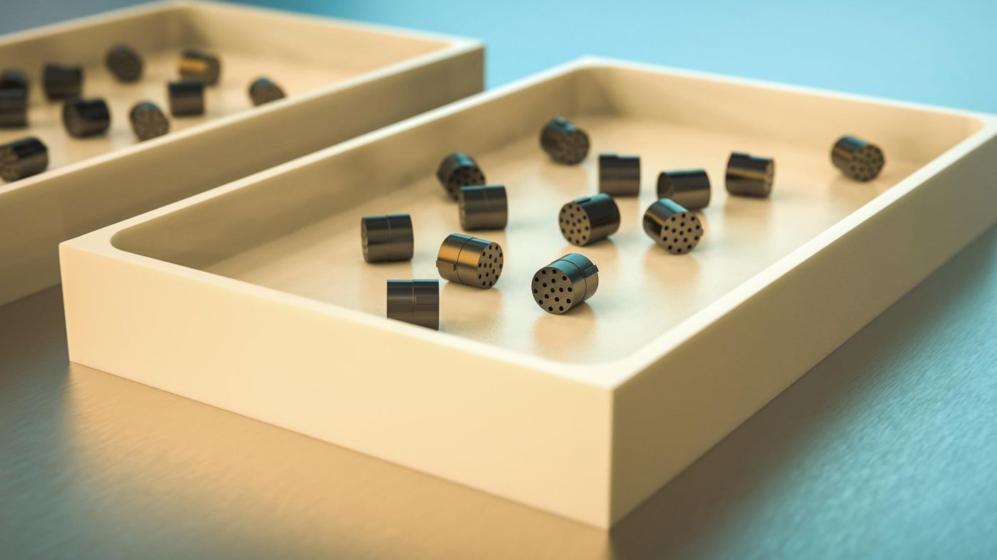 Derweil entnimmt ebenfalls kamerabasiert ein zweiter Sechsachsen-Knickarm-Roboter von der zweiten Zuführung einen Kontakt. Dies erfolgt der Assemblierungsreihenfolge entsprechend, weshalb eine weitere Vision-Kamera zunächst prüft, ob der Kontaktstift den korrekten Dimensionen entspricht. Eine dritte Kamera misst dessen Ausrichtung, da der Winkel für die korrekte Montage im Isolator entscheidend ist.