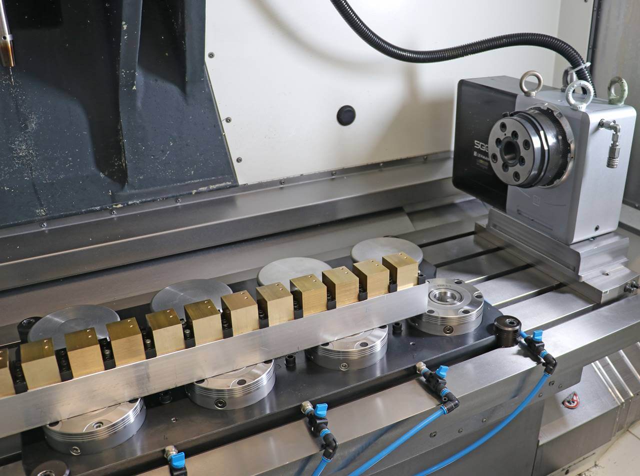 Punkt 1: Der pL-Drehtisch EA-520 wird mit zwei Gressel gredoc-Nullpunktspannern auf dem Maschinentisch befestigt. Dadurch lässt er sich im Bedarfsfall innerhalb von 15 Minuten komplett entfernen und ohne langwieriges Einmessen wiedereinsetzen. «Das kommt nicht allzu häufig vor», gesteht Ettemeyer ein, «denn wir haben ihn ganz am Rande des Tisches ausserhalb des Verfahrbereichs der X-Achse platziert. Somit lässt er noch genügend Platz für mehrere Schraubstöcke beziehungsweise Vorrichtungen für die Mehrfachspannung und kann, auch wenn er nicht benötigt wird, meistens auf der Maschine verbleiben.» Im vergangenen Jahr musste der Drehtisch dennoch einige Male entfernt werden, womit sich, laut Ettemeyer, der verhältnismässig geringe finanzielle Mehraufwand für die Nullpunktspanner schon gelohnt hat.