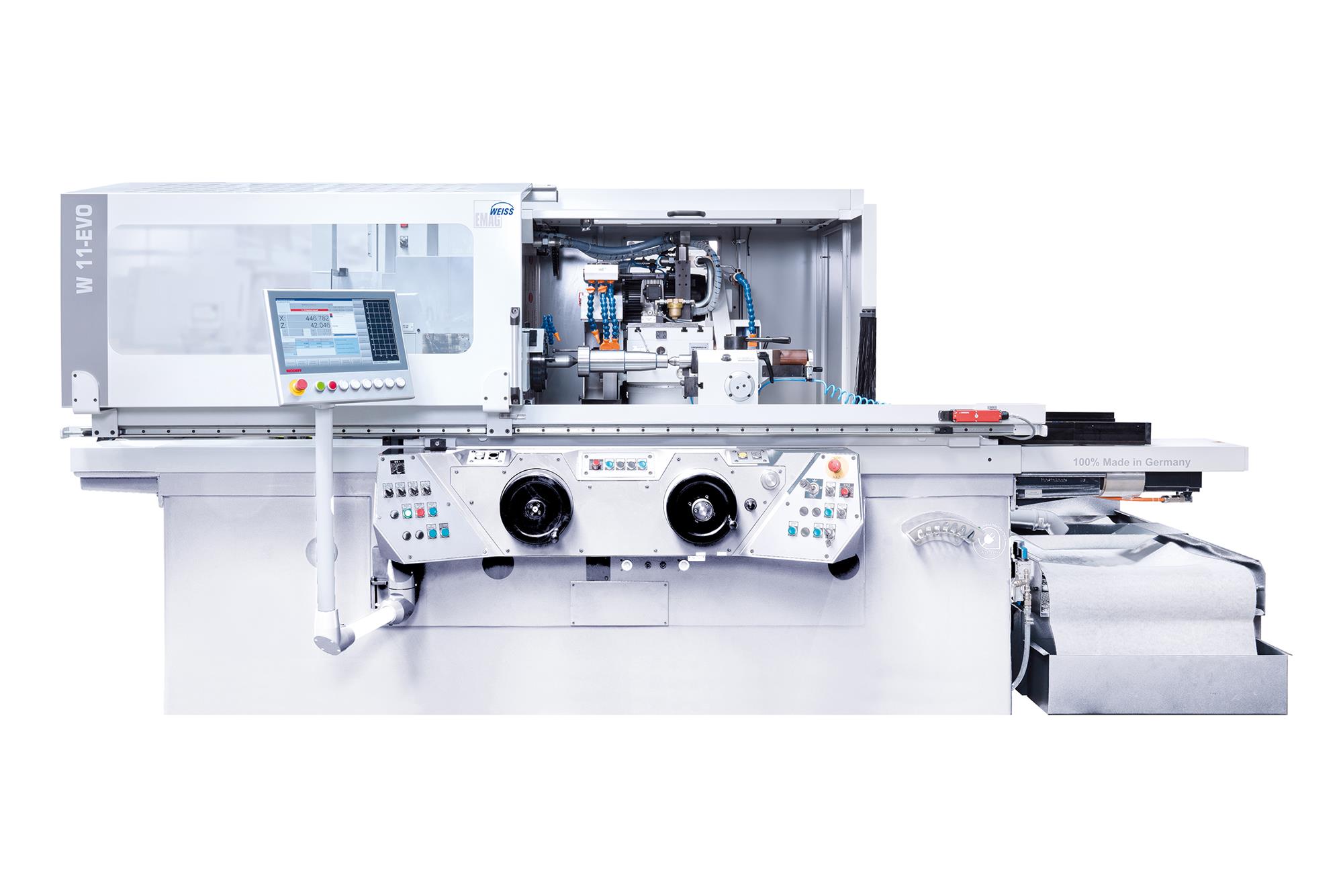 Die Baureihe W 11 ergänzt die Produktlinien der EMAG für die hochproduktive Serienbearbeitung grosser Stückzahlen auf horizontalen Schleifmaschinen um flexible Werkstattschleifmaschinen mit individuell konfigurierbarer Ausstattung. Die W 11 CNC von EMAG Weiss ist eine hochpräzise CNC-Rundschleifmaschine, die speziell für die Anforderungen der Lohnfertigung, der Medizintechnik und des allgemeinen Maschinenbaus entwickelt wurde. Sie ermöglicht das Aussen- und Innenrundschleifen mit höchster Massgenauigkeit und Wirtschaftlichkeit auch bei Kleinserien oder Prototypen. Die Maschine fasst bis zu drei Schleifspindeln auf einer schwenkbaren B-Achse. Zudem lässt sich die Maschine schnell und einfach umrüsten und bietet damit grosse Flexibilität bei wechselnden Bearbeitungsaufgaben. Ein besonderes Highlight ist die dialogbasierte Programmierung, die auch ohne fundierte Programmierkenntnisse intuitiv beherrschbar ist. Werkstücke mit 350 mm Durchmesser und 2.000 mm Länge sind kein Problem.
