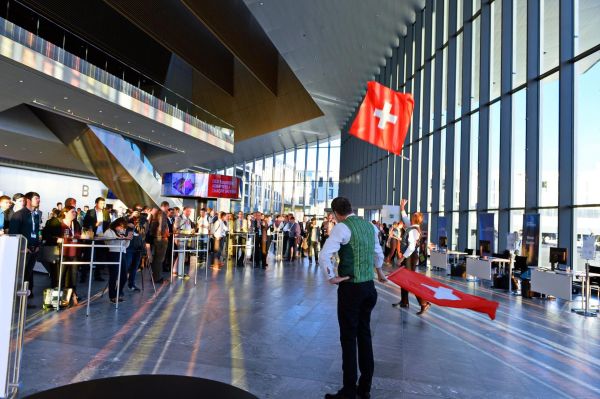 Schweizer Kultur für die technikaffinen Gäste aus der ganzen Welt: Fahnenschwinger an der Comsol-Konferenz in Lausanne.