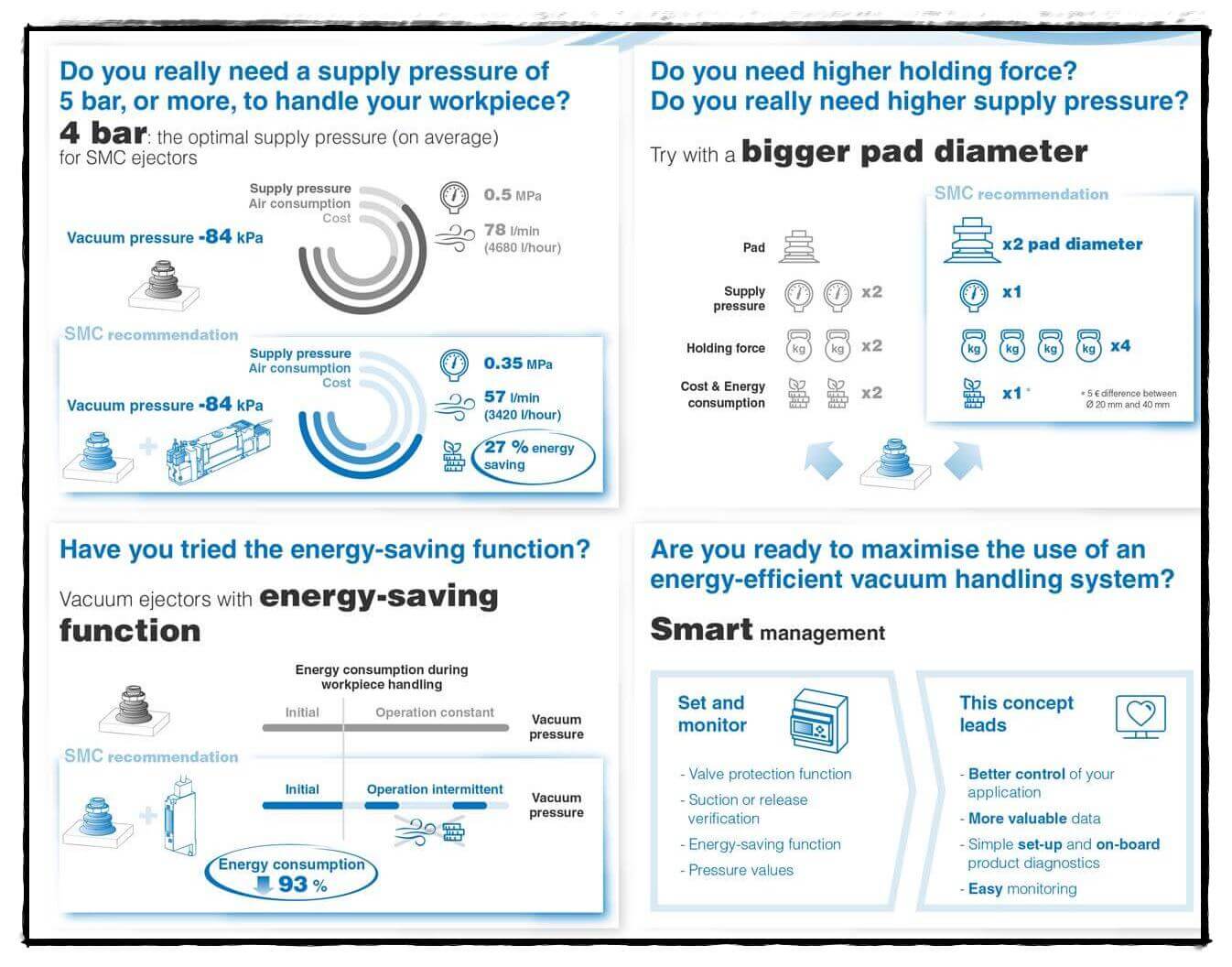 SMC zeigt vier einfache Wege, wie der Energieverbrauch eines Vakuumsystems reduziert werden kann. Denn ein niedrigerer Energieverbrauch pro Hub/Transfer trägt unmittelbar zur Unternehmensrentabilität bei und unterstützt die Anstrengungen der Industrie in Richtung Netto-Null Treibhausgasemission.