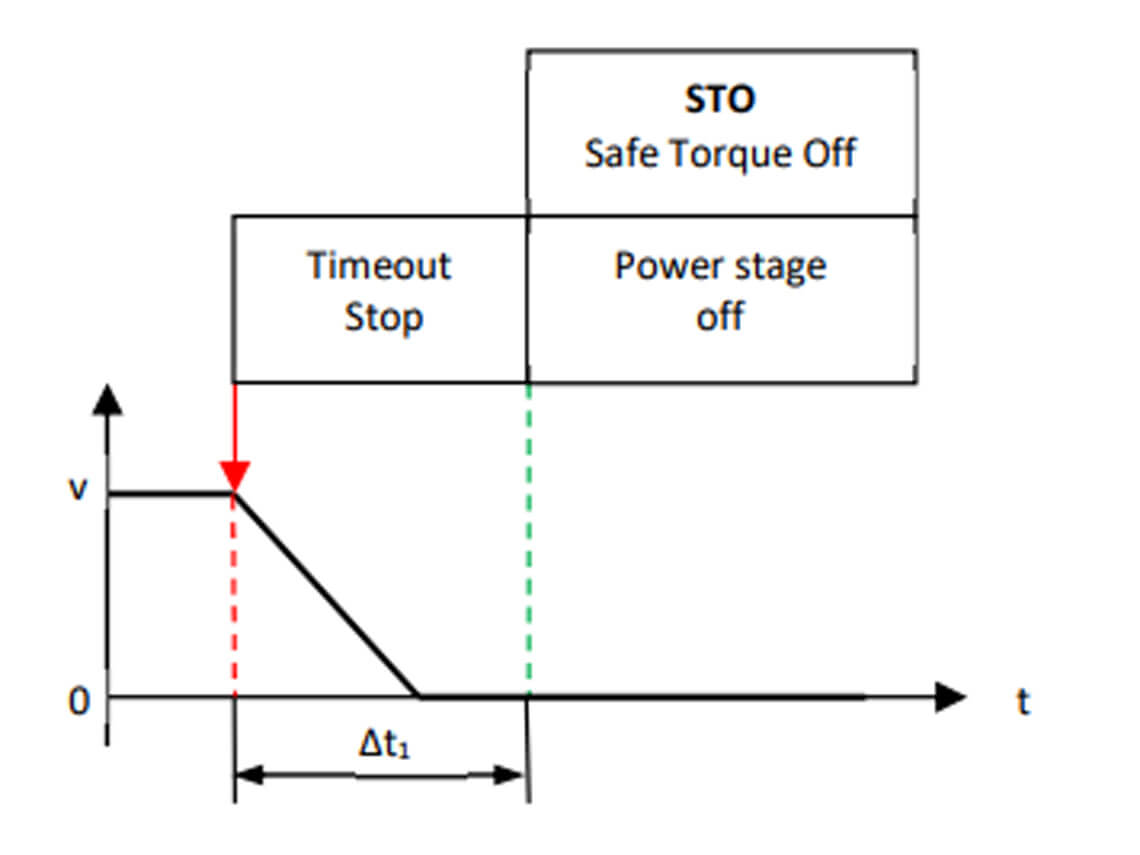 - SS2 (Safe Stop 2): überwacht die Verzögerung und hält den Motor unter Spannung (SOS - Safe Operating Stop), sobald er zum Stillstand gekommen ist. Dabei wird das Drehmoment erzeugt und die Position konstant überwacht.