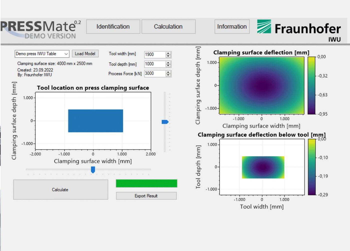 Die am Fraunhofer IWU entwickelte Software Pressmate ermöglicht, das elastische Nachgiebigkeitsverhalten der Werkzeugspannflächen von Pressen für individuelle Werkzeuge zu analysieren. Die Software basiert auf einem speziellen mathematischen Modell, das unabhängig von der jeweiligen individuellen Konstruktion der Stössel- bzw. Tischbaugruppe der Presse aufgebaut ist. Dieses Modell lässt sich durch die einfache Eingabe von Mess- oder Simulationsdaten der Presseneigenschaften kalibrieren – schnell und unkompliziert. Liegen diese Daten noch nicht vor, bietet das Fraunhofer IWU eine Kalibrierdienstleistung an. Die dafür notwendige Vermessung der Presse dauert inzwischen nur noch wenige Stunden, sodass die Kosten für das Kalibrieren und der vermessungsbedingte Anlagenstillstand überschaubar bleiben. Übrigens: Ist das Modell einmal für eine Presse kalibriert, kann dieses beliebig oft genutzt werden. Pressmate kann dann für beliebige Werkzeug-Pressen-Kombinationen das Durchbiegungsverhalten der Spannflächen berechnen. Daraus lassen sich ohne Aufwand eine Anpassung der Wirkflächen des Presswerkzeugs ermitteln, die passende Presse für ein bestehendes Werkzeug finden oder Pressen miteinander vergleichen.