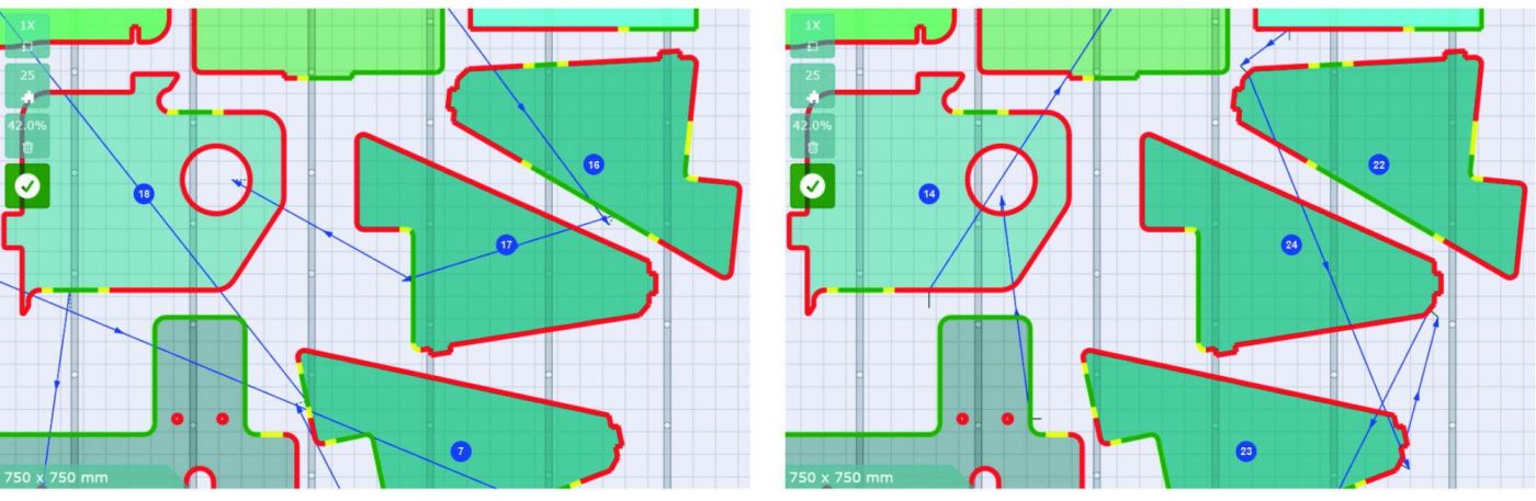 Alexandre Paradzinets: Eine andere Möglichkeit ist, dass der Schneidkopf riskante Teile umfährt. Das löst aber nicht das ursprüngliche Problem. Teile stehen damit immer noch auf und bleiben ein Risiko. Die beste Methode wäre, Schneidpläne so zu programmieren, dass Teile beim Ausschneiden gar nicht erst kippen. Aber dazu braucht es beim Programmieren entweder sehr viel Erfahrung und Zeit. Oder einen intelligenten Algorithmus, der alle Parameter automatisch berücksichtigt.