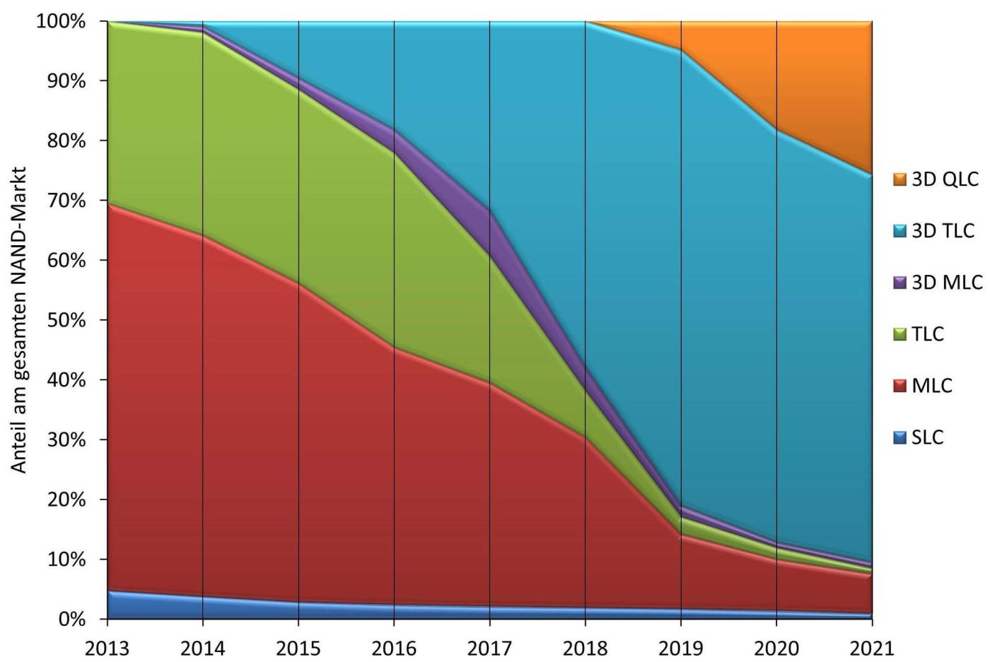 Abb. 6 zeigt die stückzahlbereinigte Verbreitung verschiedener NAND-Flash-Technologien. Während die Versorgung mit NAND-Flash niedriger Integration wie SLC und MLC bereits stark zurückgegangen ist, erscheint am Horizont die neue QLC-Technologie. Die Integrationsdichte in Gigabit pro Chip steigt, und der Preis pro Bit sinkt, so dass die Kosten pro Chip annähernd gleichbleiben werden. Die TLC-Technologie hat durch die Inbetriebnahme neuer Fertigungslinien Fahrt aufgenommen und wird den grössten Teil des Marktes übernehmen. Die Bezeichnung 3D steht in der Grafik für die vertikale Anordnung mehrerer Dies
