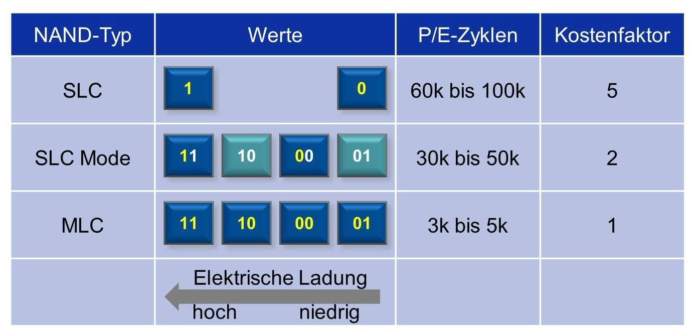 Der MLC, TLC oder QLC-Flashspeicher wird betrieben, als könne er nur ein Bit pro Zelle speichern. Vorteile: Grössere P/E, höhere Zuverlässigkeit; Nachteile: geringerer Speicherplatz, höhere Kosten