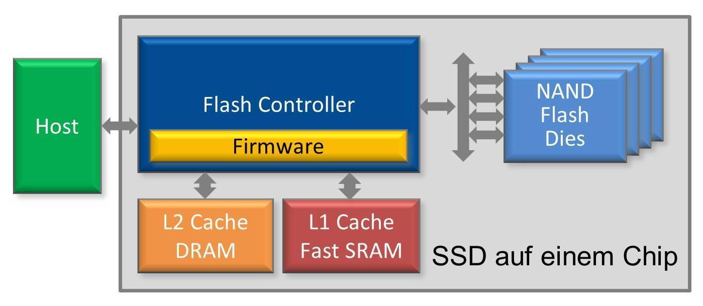 Flash-Bausteine werden in der Praxis nicht direkt mit einer Host-CPU verbunden. Zwischen den Host und den Speicher ist ein Controller geschaltet, der zur Host-Seite hin ein Standard-Interface anbietet und die Speicher mit Hilfe einer spezialisierten Firmware unter Kontrolle hat. Bei einer SSD leistet der Controller viele Funktionen, um dem Speicher-Subsystem bei höchster Zuverlässigkeit ein langes Leben und hohe Geschwindigkeit zu geben. Dazu gehört das Wear Levelling, mit dem Schreibvorgänge auf den gesamten Speicher verteilt werden, um die Lebensdauer des Systems zu erhöhen, und das Management defekter Blöcke. Eine weitere Funktion ist die Ansteuerung und Verwaltung eines Caches, um die Zugriffsgeschwindigkeit besonders beim Schreiben zu erhöhen. In schnellen Systemen ist dieser Cache mehrstufig (siehe Abb. 3) angelegt.